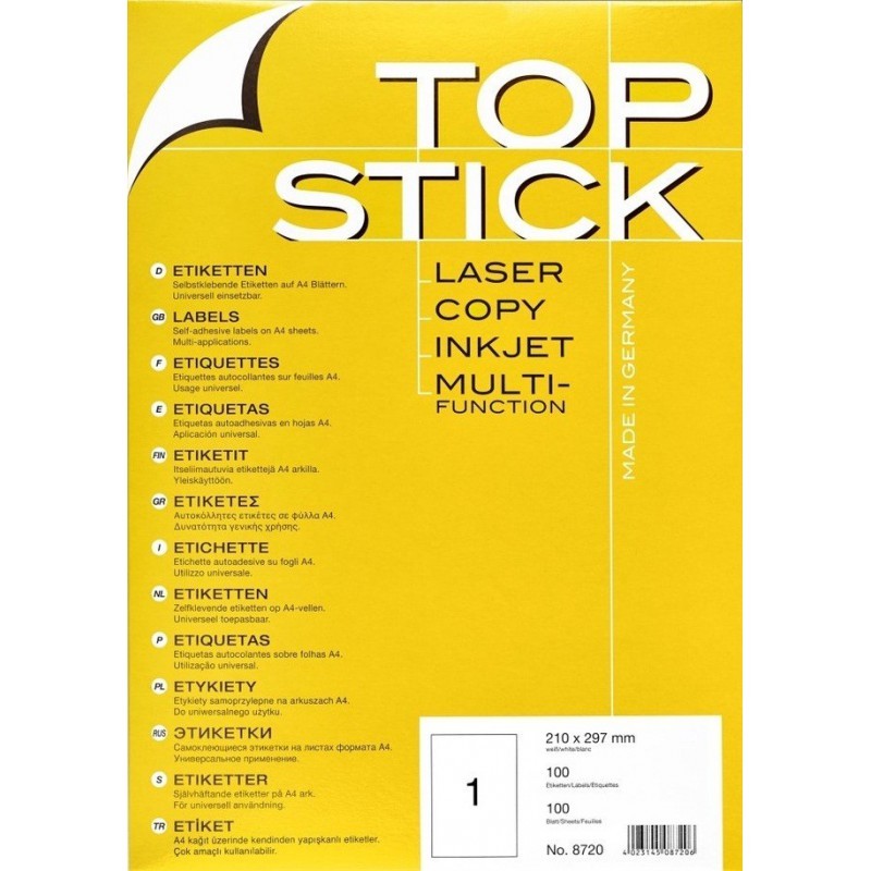 100x Etiquettes TOP STICK - Etiquettes autocollantes en blanc sur feuille de format A4 - 1 pièce par feuille - Paquet de 100 feuilles - Format: 210 x 297 mm - Pour imprimantes laser, copieurs et imprimantes jet d'encre