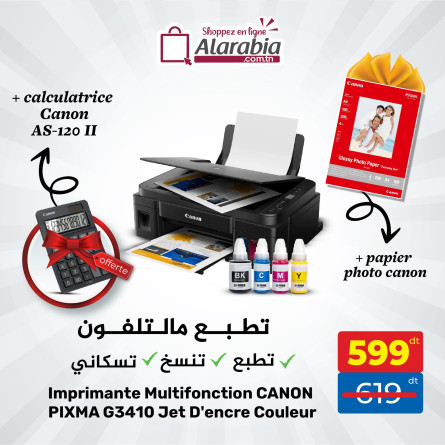 Imprimante à Réservoir Intégré CANON Pixma G3410 - Fonctions: Impression, copie et numérisation - Technologie d'impression: Jet D'encre - Écran 1,2 pouces LCD - Vitesse d'impression en N&B/couleur: env 8,8 ipm / env. 5 ipm - Résolution d'impression: 4800 x 1200 ppp - Vitesse de Numérisation: environ. 19 sec - Résolution de Numérisation: 600 x 1200 ppp - Formats Papier: A4 - Grammage papier: 64 à 105 g/m² (Papier ordinaire), jusqu'à 275 g/m² (Papier photo Canon) - Connectivité: USB , WiFi - Dimensions: 445 × 330 × 163 mm - Poids: environ 6,3 kg - Couleur: Noir - Garantie: 1 an