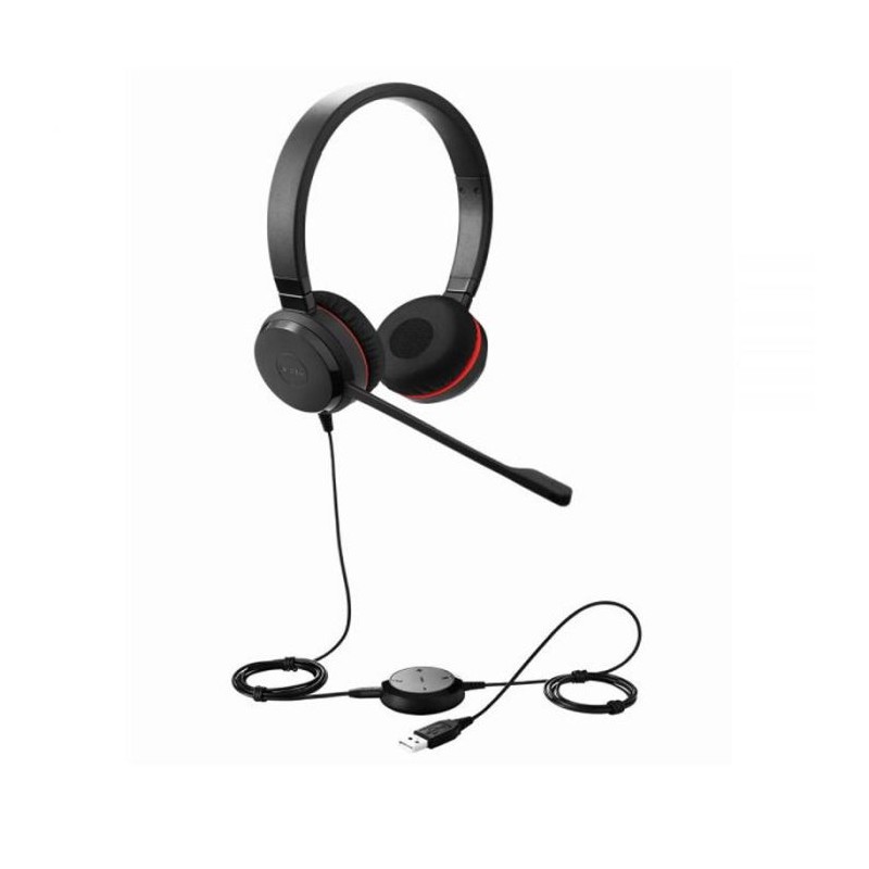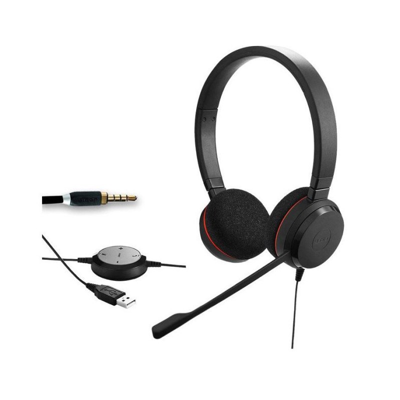 Micro Casque JABRA Evolve 30 II UC Duo - Connectivité: Filaire - Interface avec l'ordinateur: USB Type-A, jack 3,5 mm - Taille du haut-parleur: 28 mm - Réponse en Fréquence: 150 - 7000 Hz - Sensibilité: 93.6 dB - Impédance Casque: 32 Ohm - Longueur du câble: 1.2 m - Compatibilité: PC/ordinateur portable, smartphone - Micro Antibruit - Connexion USB avec fonction "muet" et contrôle de volume sur cordon- Coussinets simili cuir - Certifié Microsoft - Garantie: 1 an