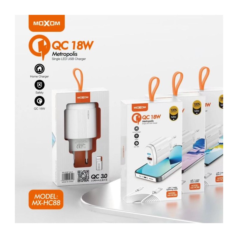 Brand: MOXOM. Model: MX-HC88. cable Length: 1m. Input: AC110-240V, 50-60Hz, 400mA. Output: 5V=3A, 9V=2A, 12V=1.5A. Ports: (Type-C), QC 18W (USB). Compatible: Micro-USB, Type-C and Lightning devices. Adapter type: EU Plug. With Cable. There are three types available: Micro-USB Type-C Lightning