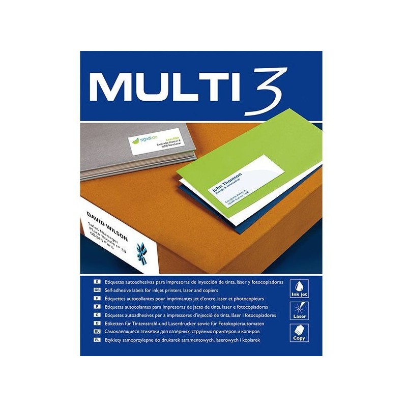 Etiquette blanche Multi 3 - Format: 70x25,4 mm - Étiquettes adhésives permanentes - Colle acrylique à base d'eau - Taille de la feuille: Din A4 - Nombre de feuilles par pack: 100 Feuilles - Nombre par feuilles: 33 - Couleur: Blanc.