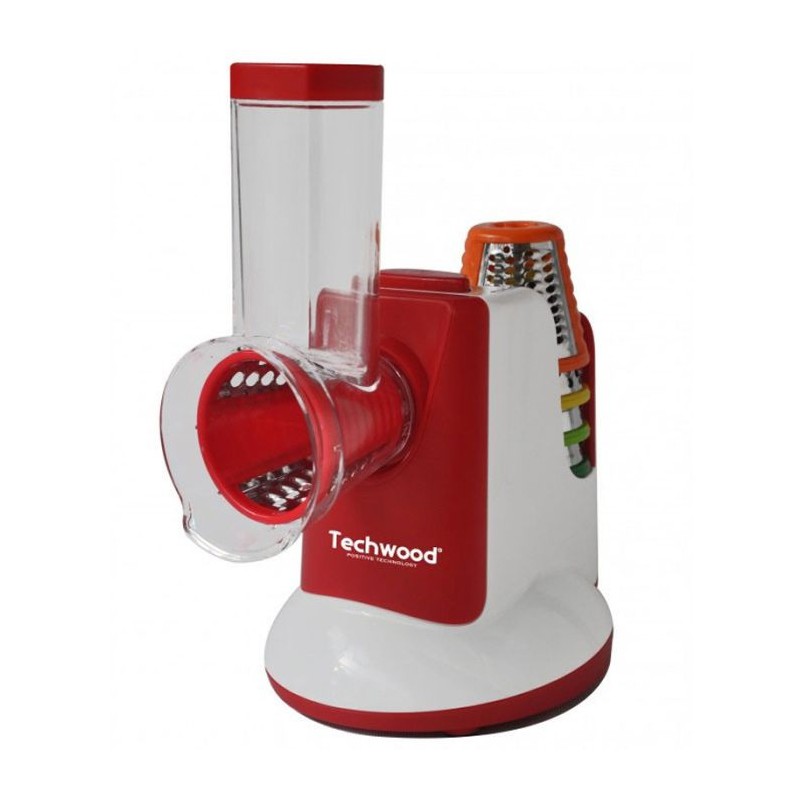 Râpe Légume TECHWOOD - Puissance: 150watts - 3 Râpes différentes: 1 fine, 1 grosse + 1 pour broyer - Adaptées aux ingrédients à râper - 2 Eminceurs, 1 lame tranche fine + 1 lame tranche épaisse et ondulée - Lame en inox et protections plastique de couleur différente pour un repérage et un usage plus facile - Changement des accessoires très simple - Nettoyage des éléments rapide et facile (compatible lave-vaisselle) - Design moderne et encombrement minimum - Range cônes à l'arrière de l'appareil - Couleur: Rouge - Garantie: 1an