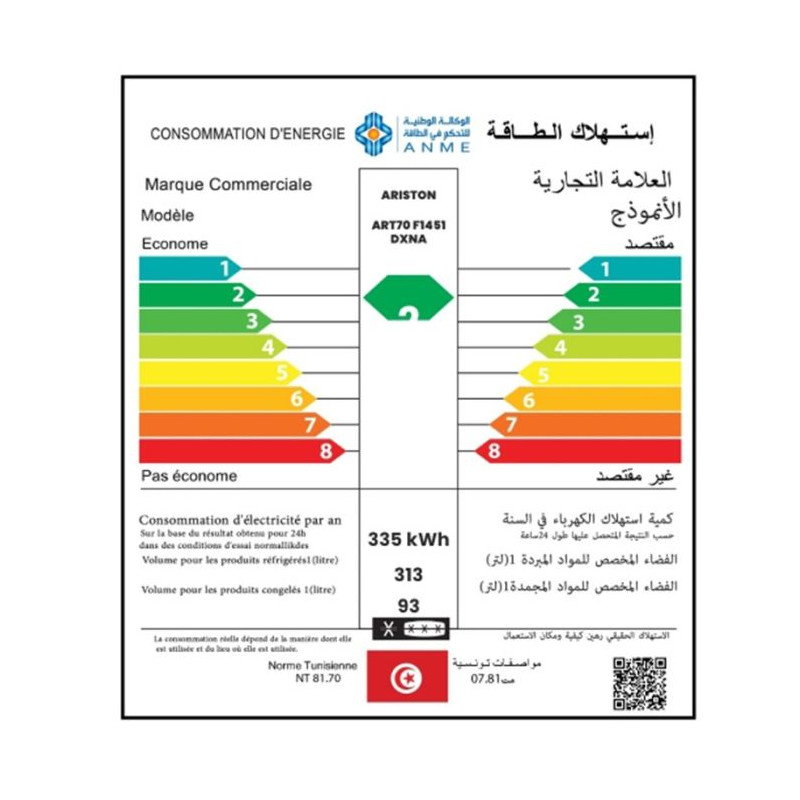 Réfrigérateur ARISTON - 2 Portes - Système de Refroidissement: NoFrost - Volume brut: 455 Litres - Volume net: 406 Litres - Volume Net du Réfrigérateur: 313 Litres - Volume Net du Congélateur: 93 Litres - Capacité de congélation: 6 kg/24h - Classe énergétique: A++ - Consommation d'énergie: 335 kWh/an - Éclairage LED - Compresseur Inverter - R600a - Niveau sonore: 39 dBA - 4 étagères (3 étagères réglables pleine profondeur) - 1x Bac à Légume - 4x Balconnets - Bacs à glaçons - Dimensions: H x L x P: 185 x 70 x 70 cm - Couleur: Inox - Garantie: 3 ans