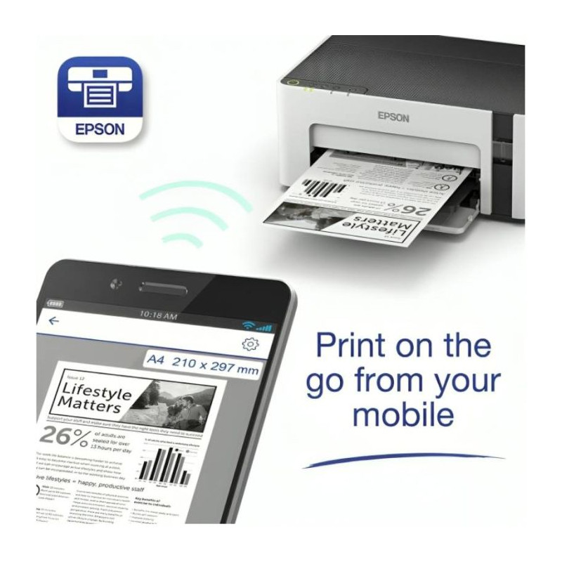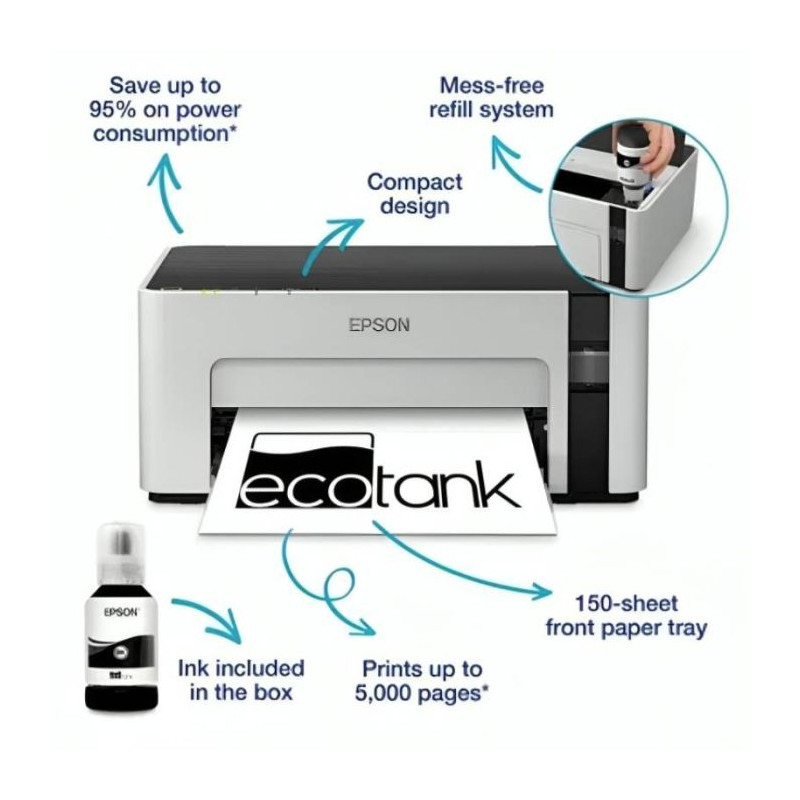 Imprimante EPSON ECOTANK M1120 - Technolgie d'impression: Jet d'encre (Tête d'impression Epson Micro Piezo) - Fonction: impression - Format Papier: A4 - Vitesse d’impression: 15 pages/min (ISO/IEC 24734), 32 pages/min (papier ordinaire) - Résolution d'impression: 1440 x 720 DPI (ppp) - Impression recto/verso: Manuel - Connectivité: USB, Wi-Fi, Wi-Fi Direct - Dimensions: 375 x 267 x 161 mm - Garantie: 1 an