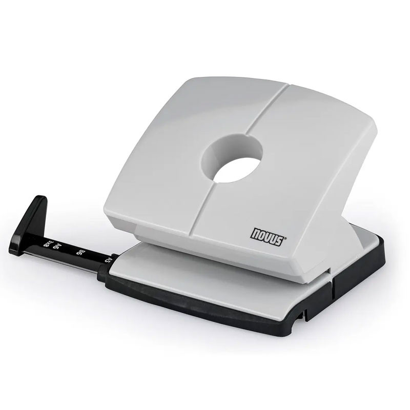 Perforateur NOVUS B220 - Matériau: Métal - Capacité: 20 feuilles (80g/m²) - Nombre de trous: 2 - Diamètre des trous: 5,5 mm - Écartement des poinçons: 80 mm - Formats: DIN A4,DIN A5,DIN A6;DIN B5,DIN B6,Folio,US (quart) - Barre de butée à enclenchement sûr avec repères de format bien lisibles - Socle antidérapant avec ouverture facile pour le vidage - Couleur: Gris