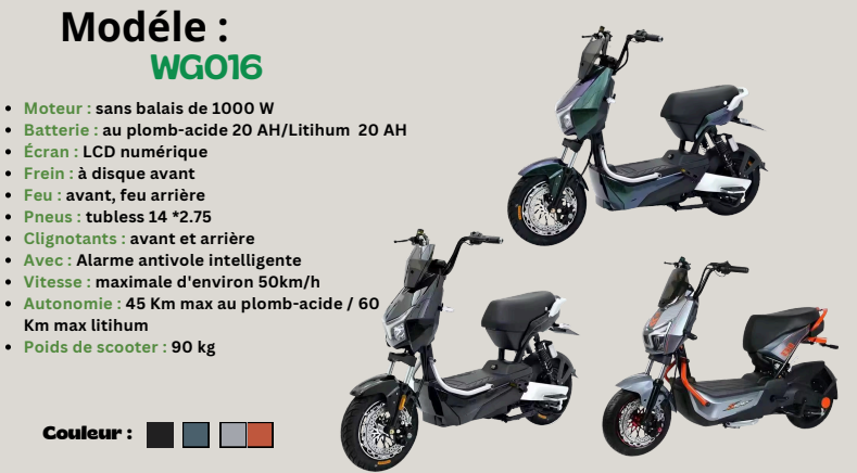 Moteur : sans balais de 1000 W Batterie : au plomb-acide 20 AH - Écran : LCD numérique Frein : à disque avant Feu : avant, feu arrière Pneus : tubless 14 *2.75 Clignotants : avant et arrière Avec : Alarme antivole intelligente Vitesse : maximale d'environ 50km/h Autonomie : 45 Km max au plomb-acide Poids de scooter : 90 kg - BATTERE ACIDE