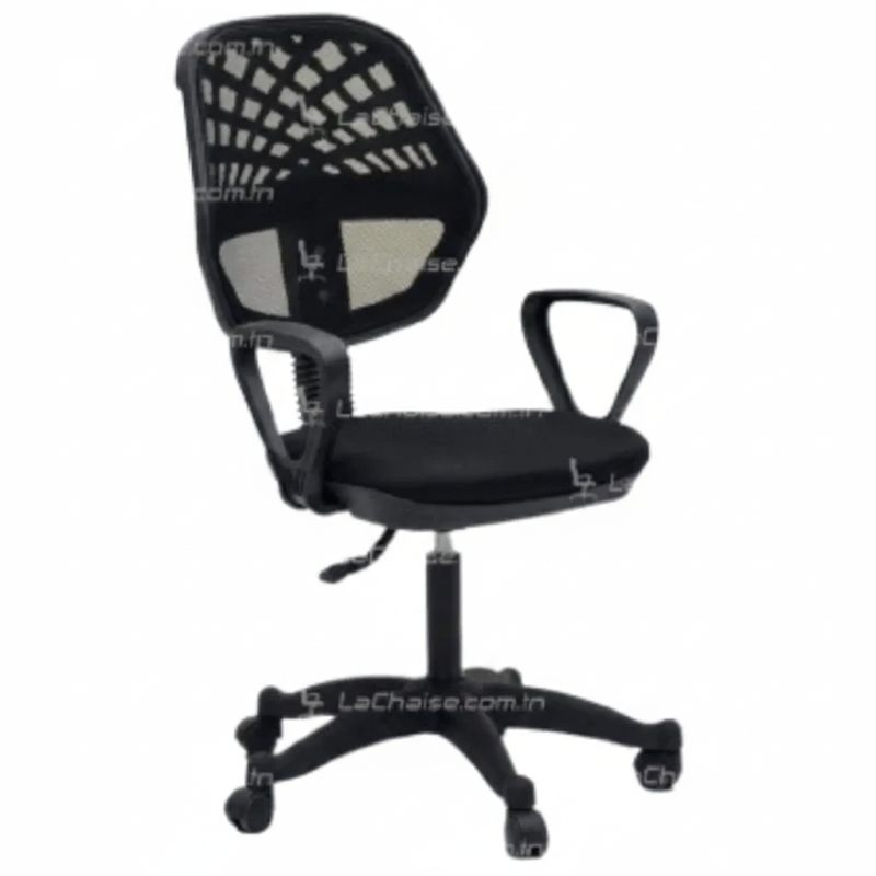 Chaise Evo avec accoudoirs – Noir avec assise et dossier en tissu résille noir. Base étoile 5 branches en PVC noir avec roulettes. Conception réglable en hauteur pour un confort optimal. Robuste et durable, elle apporte une touche supplémentaire à votre bureau. Couleur : Noir, Base : Noir.