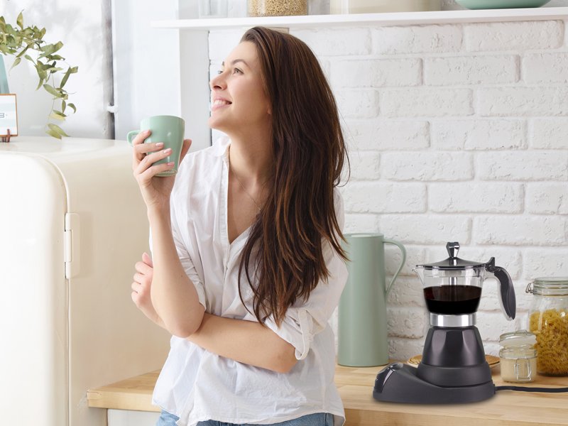 Cafetière électrique d'une capacité de 3 tasses et 1 réducteur de tasse - Corps et filtre en aluminium - Base rotative à 360° et bouton d'alimentation avec voyant de fonctionnement - Équipé d'une fonction de maintien au chaud de 30 minutes et d'une protection contre la surchauffe - Idéal pour la maison et le bureau - Poignée ergonomique - Puissance : 400 Watt - Couleur : Noir